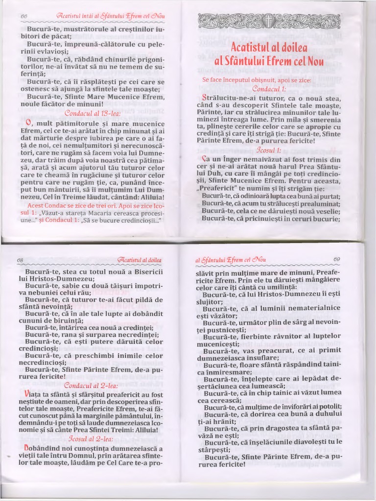 Acatistul Sfintului Efrem Cel Nou Facatorul De Minuni By Daniel Roteliuc Issuu Source from : https://issuu.com/danielroteliuc/docs/__acatistul_sfantului_efrem_cel_nou Împărăteasa mea preabună şi nădejdea mea, născătoare de dumnezeu. Condacul 1să se bucure credincioşii şi să se veselească. Sfântul efrem cel nou (conform vedeniilor n. Pentru că aș râde cu intensitate maximă. Sfântul efrem cel nou este cinstit ca un mare tămăduitor, fiind cunoscut drept ocrotitor al celor dependenți de droguri, al celor cuprinși de depresie și al celor deznădăjduiți.