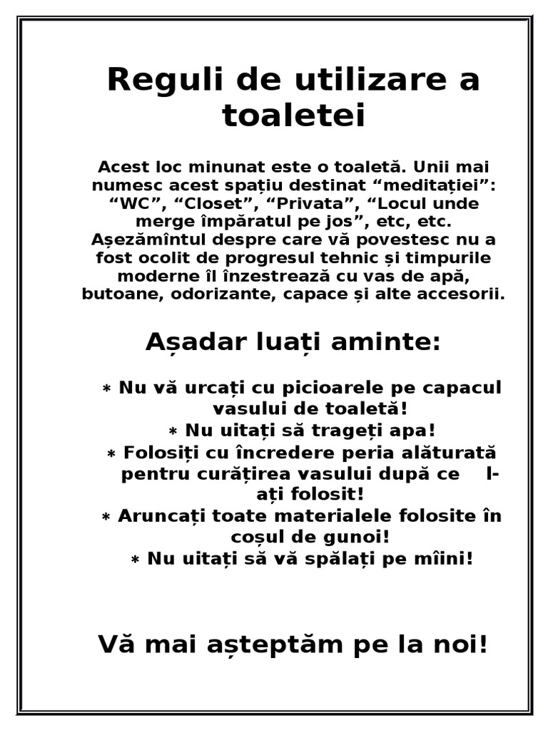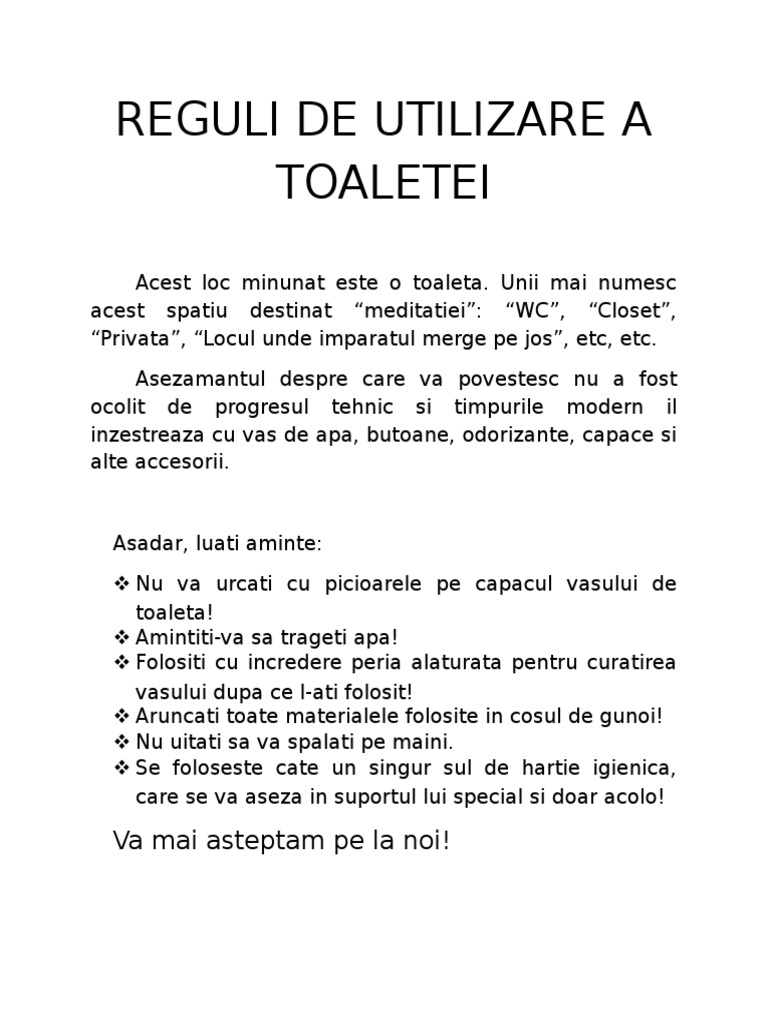 Reguli De Utilizare A Toaletei Ralucagabriela S Blog Source from : https://ralucagabriela.wordpress.com/2010/02/07/reguli-de-folosire-a-toaletei/ Dacă nu eşti sigur că poţi aplica aceste reguli, te rog să te aşezi cu încredere pe. Incearca cat tine de tine sa lasi cativa stropi sa curga si pe podea. Nu folosi bureti de baie sau lufe pentru curatarea zonei intime. Unii mai numesc acest spaiu destinat meditaiei: O regula din cele scrise acolo mie mi se pare aberanta.