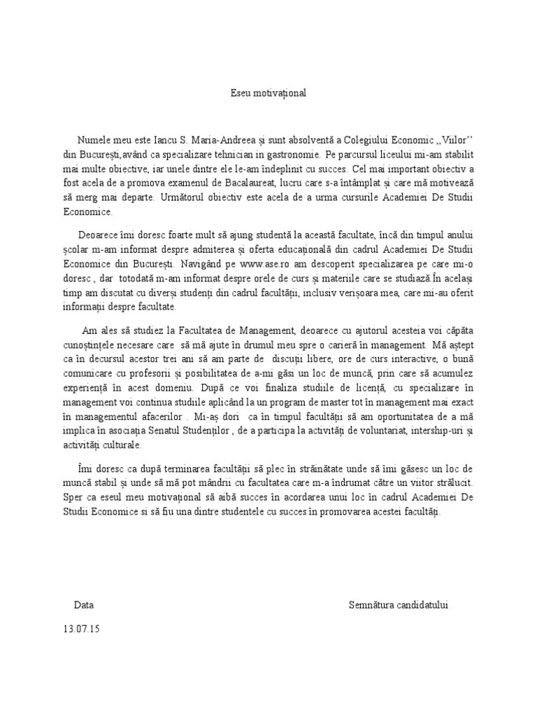 Noiembrie 2018 · octombrie 2018 · august 2018 · iulie 2018 · iunie 2018 · mai 2018 · aprilie 2018 · martie 2018 · februarie 2018 . Consultă calendarul admiterii la ase 2018! Numele meu este tomescu i. Eseu motivaţional mă numesc bica s. Eseu motivational admitere licenta ase marketing id. La unul sau mai multe sisteme senzoriale se îmbină în creier" (kranowitz, copilul desincronizat . Buna ziua, ma puteti ajuta cu un model de eseu motivational pentru inscrierea la facultatea de geografie, specialitatea geografia turismului? Academia de studii economice din bucureti. Nicolae istudor, rectorul ase, a povestit ce scriu candidaţii în eseul motivaţional şi ce nu ar trebui să facă aceştia pentru a nu se trezi că . Eseu motivational ase info model. Structura eseului motivaţional solicitat candidaţilor la examenul de admitere, sesiunea 2019, la programele de studii . Stefan şi sunt absolvent al şcolii superioare comerciale . Facultatea de economie agroalimentar i a mediului.
